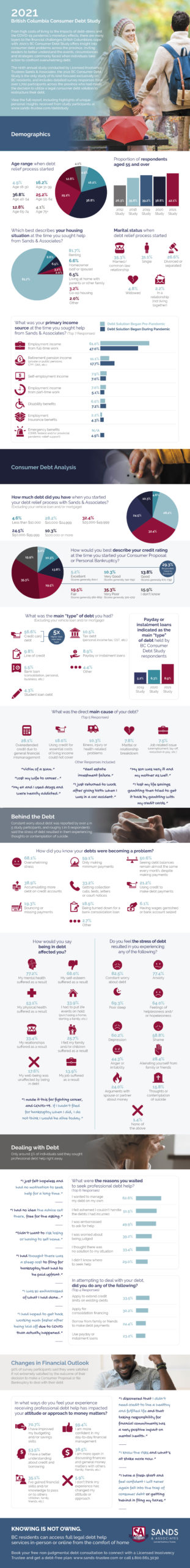 Conducted by Sands & Associates, BC’s largest firm of Licensed Insolvency Trustees focused on debt services for individuals and small businesses, the 2021 BC Consumer Debt Study polled over 1,700 consumers from across the province who declared personal bankruptcy or legally consolidated debt with a Consumer Proposal and provides a unique perspective on consumer debt issues.